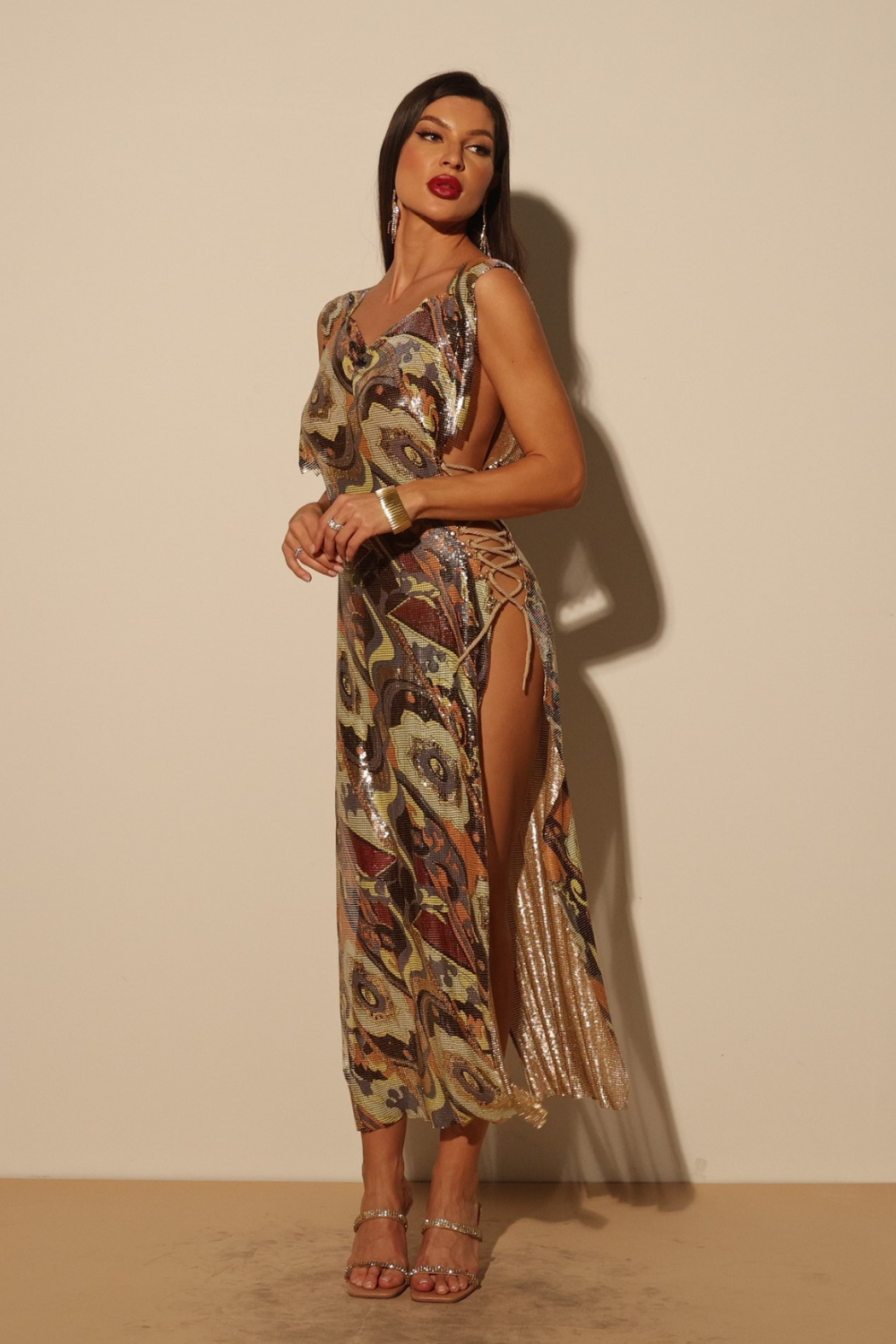 Step into the spotlight with our Bohemian Luxe Chainmail Dress, a stunning fusion of retro vibes and modern glamour. Crafted from shimmering metal mesh, this dress features an eye-catching abstract print with a draping silhouette that flatters every curve. Designed for the daring fashionista, it boasts a backless cut and seductive double side tie-ups, offering a customizable fit that’s as unique as you are.