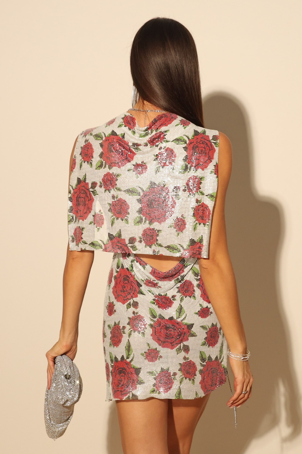 Turn heads with this captivating Red Rose Chainmail Mini Dress from ShinyGal. This unique piece features an exquisite metallic mesh adorned with bold red roses, creating a blend of edgy and romantic style. The dress drapes gracefully with a cowl neckline and an alluring backless design, perfect for making a statement at evening events or a night out. The high side slit and sleeveless cut enhance its flirty, figure-flattering silhouette, adding movement and glam to every step. Pair with bold accessories and get ready to shine and dazzle the crowd.
