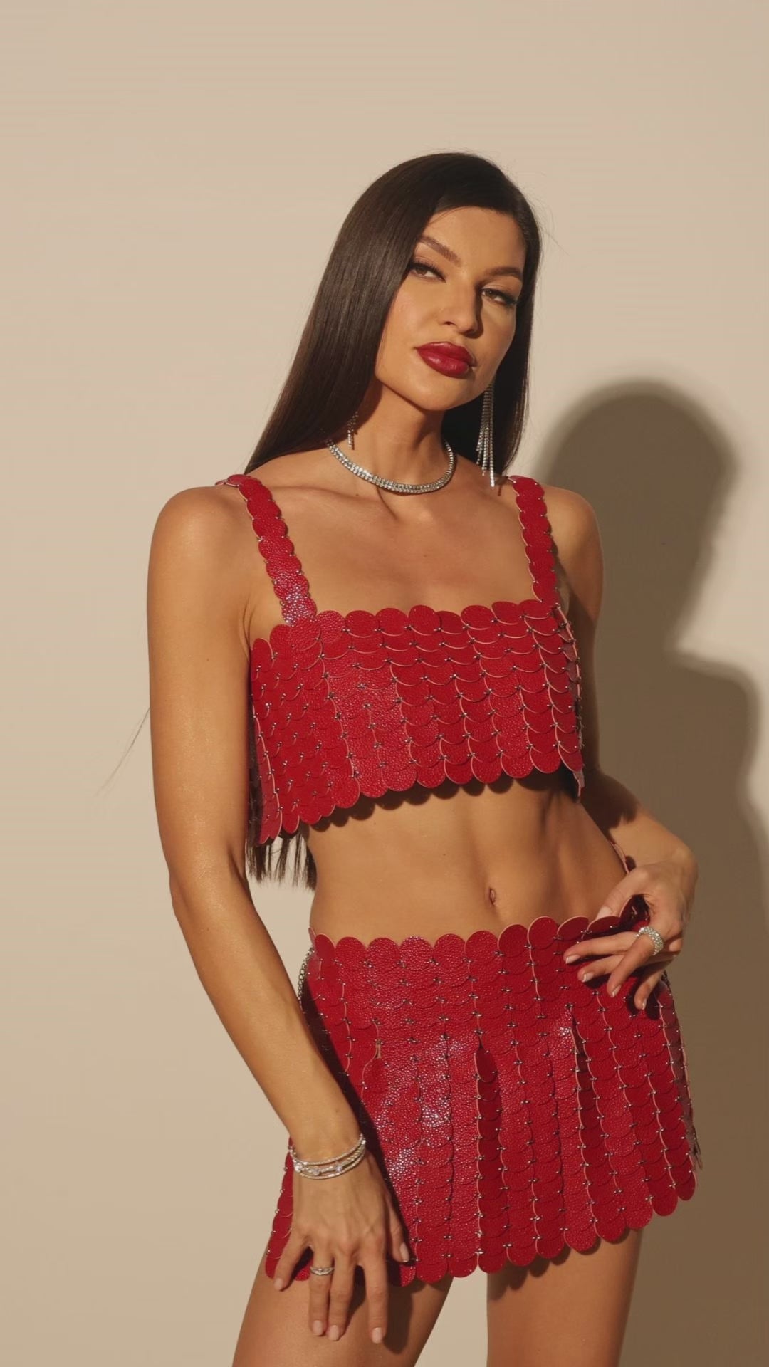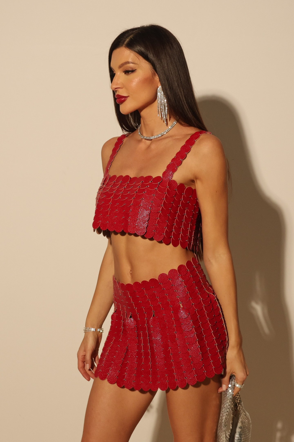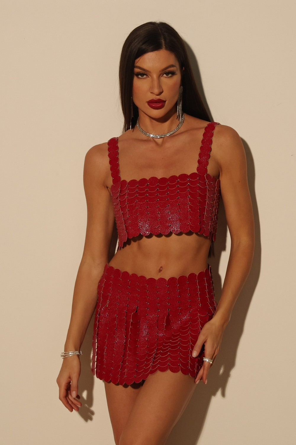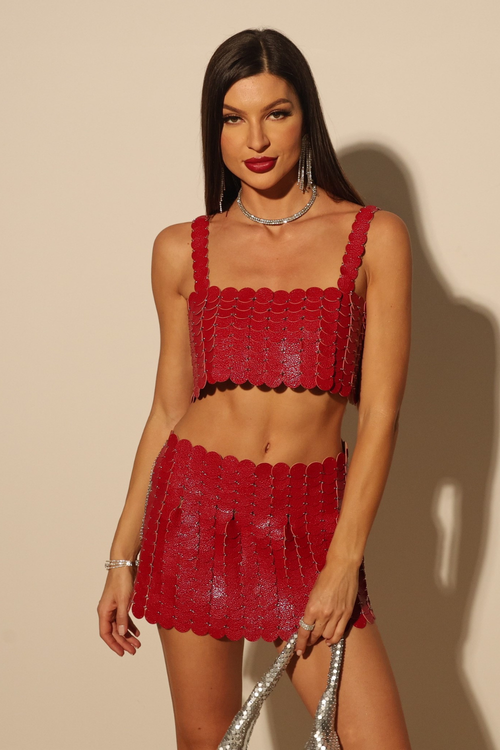 Dare to be unforgettable in this eye-catching red PU leather skirt set. Designed with overlapping, scalloped discs, this two-piece set adds a modern twist to retro glam. The crop top features wide straps and a straight neckline, offering just the right balance of coverage and allure. The matching mini skirt sits high on the waist, with each circular detail catching the light for a dazzling effect. Perfect for nights out or special events, this set makes a bold statement, combining edgy style with a vibrant pop of color. Pair with sparkling accessories and step into the spotlight with confidence.