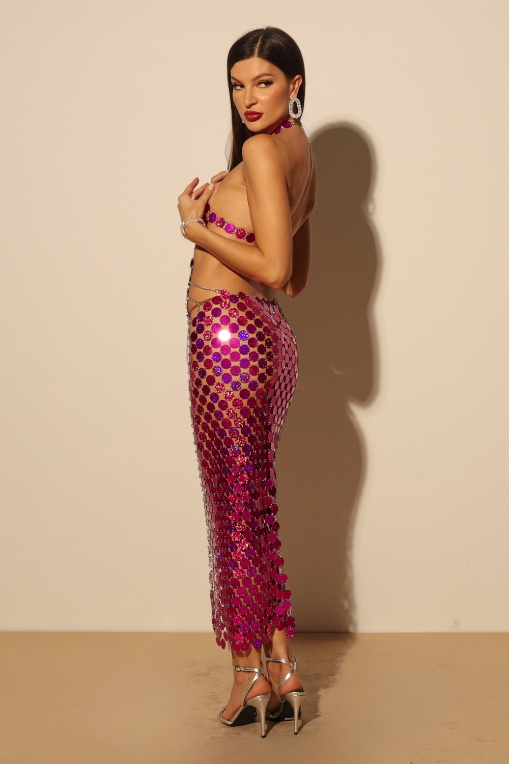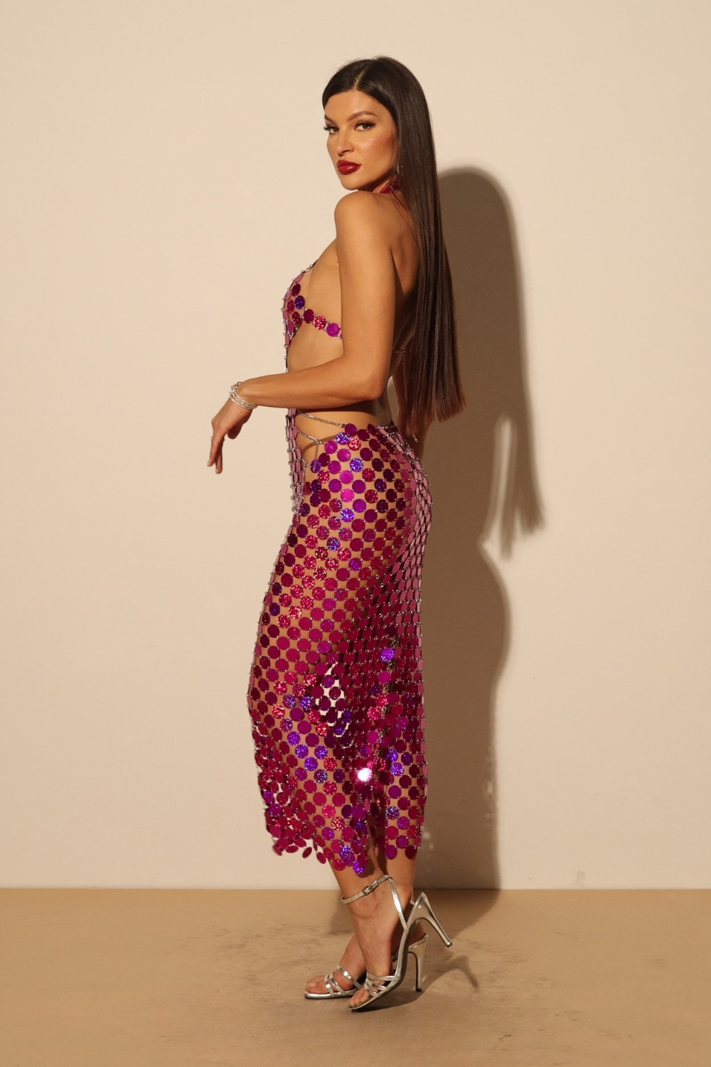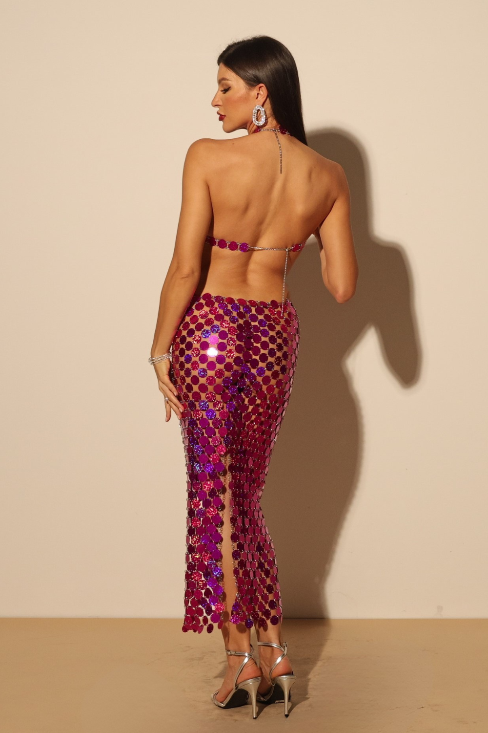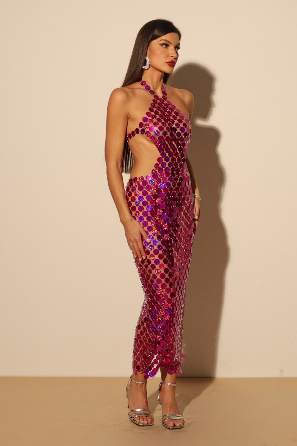 Steal the spotlight in our Fuchsia Radiance Sequin Dress—a dazzling fusion of bold color, shimmering movement, and sultry design. This handcrafted masterpiece features glossy fuchsia and purple sequins, meticulously connected with metal rings to create a fluid, eye-catching silhouette.