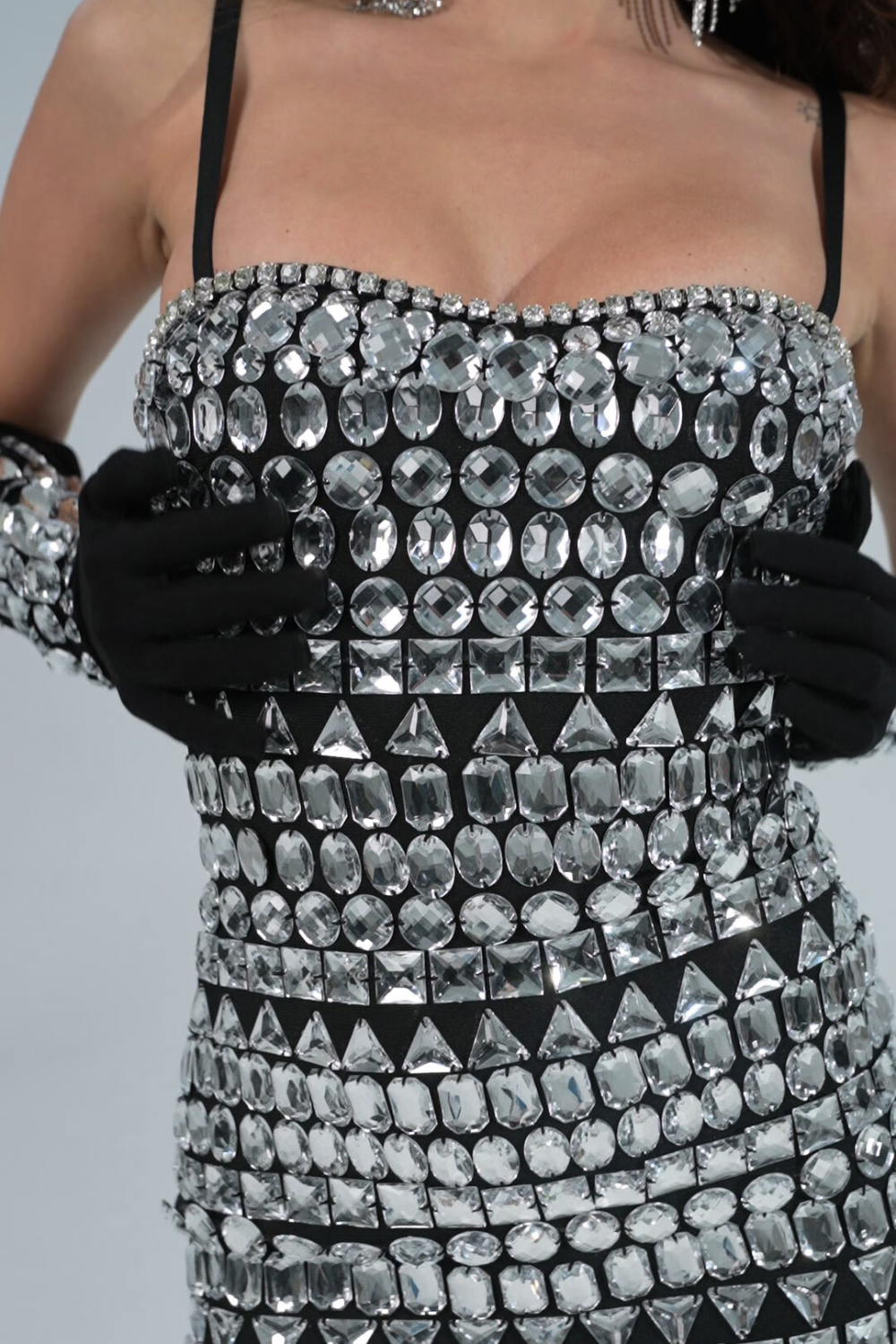 Step into the spotlight with our stunning "Gemstone Glam" black mini dress. This mesmerizing piece features a captivating design that effortlessly combines elegance and allure. The front of the dress is meticulously hand-sewn with an array of dazzling big crystal gems, creating a mesmerizing focal point that catches every glimmer of light.