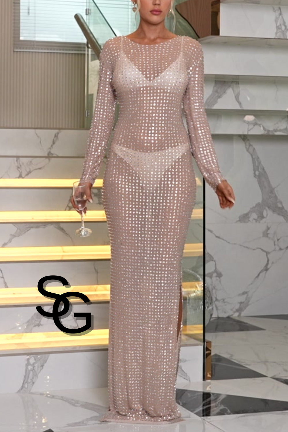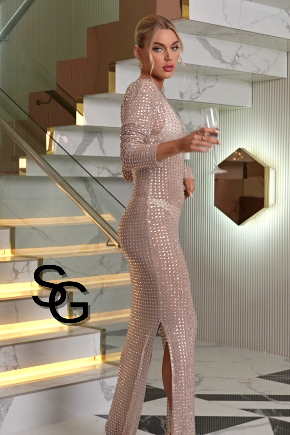 This Luxury Full Crystal Maxi Mesh Dress is a stunning addition to any wardrobe. Made from a light weight mesh material, the full-length dress features side slits and a bodycon curvy fit. Adorned with eye-catching crystals, this dress is sure to turn heads. Its flattering cut is perfect for elegant occasions and the lavish crystals make it an exceptionally luxurious piece.
