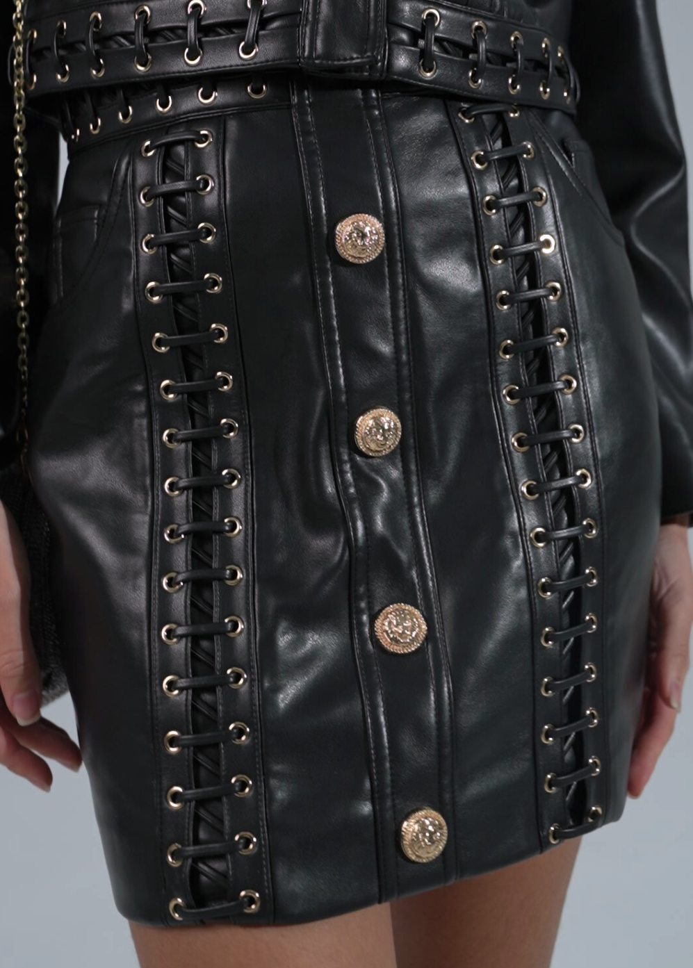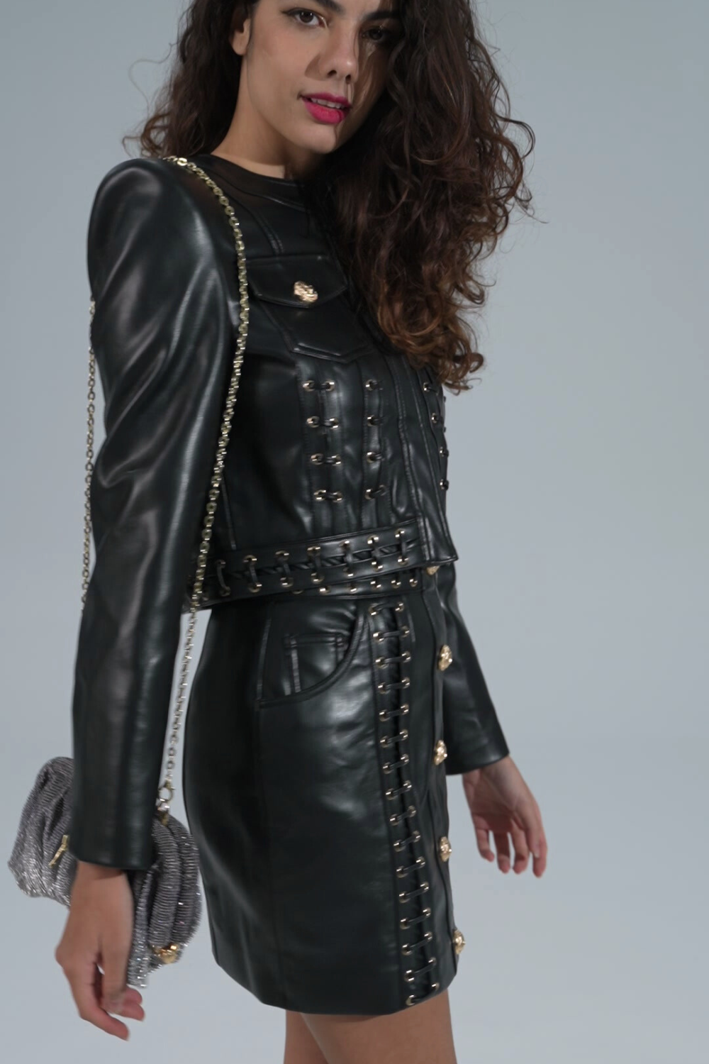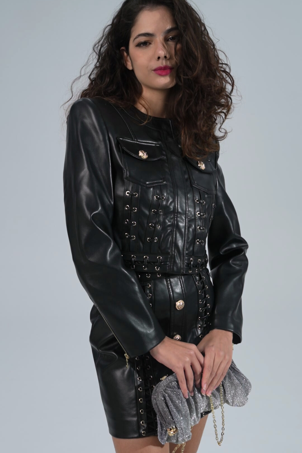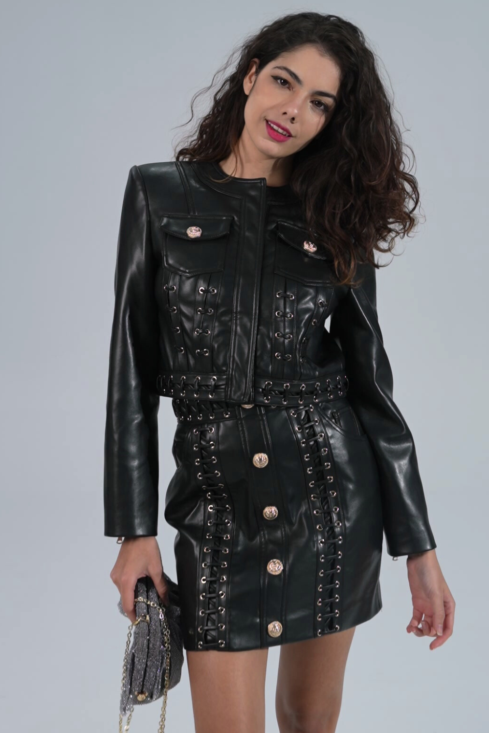This faux leather jacket and skirt set is perfect for anyone looking to rock an edgy punk look. Crafted with a long sleeve jacket and high waisted mini skirt, this combo is both stylish and versatile. The faux leather material gives an authentic look and feel. Complete the look with your favorite boots. Only be noticed that the jacket and skirt are selling seperatedly.
