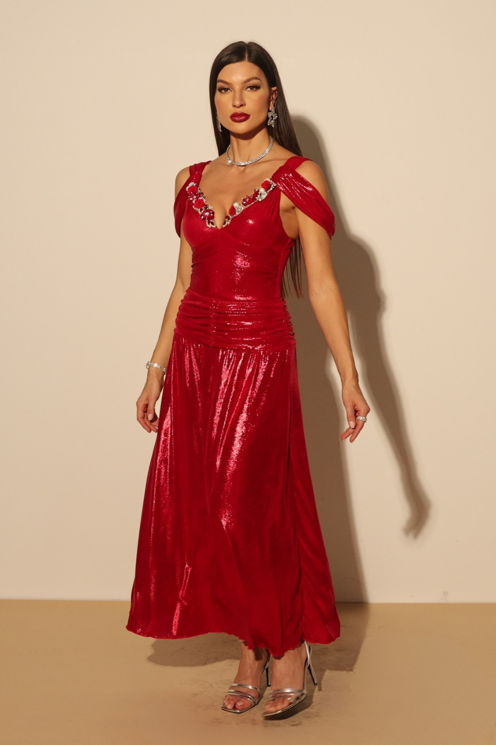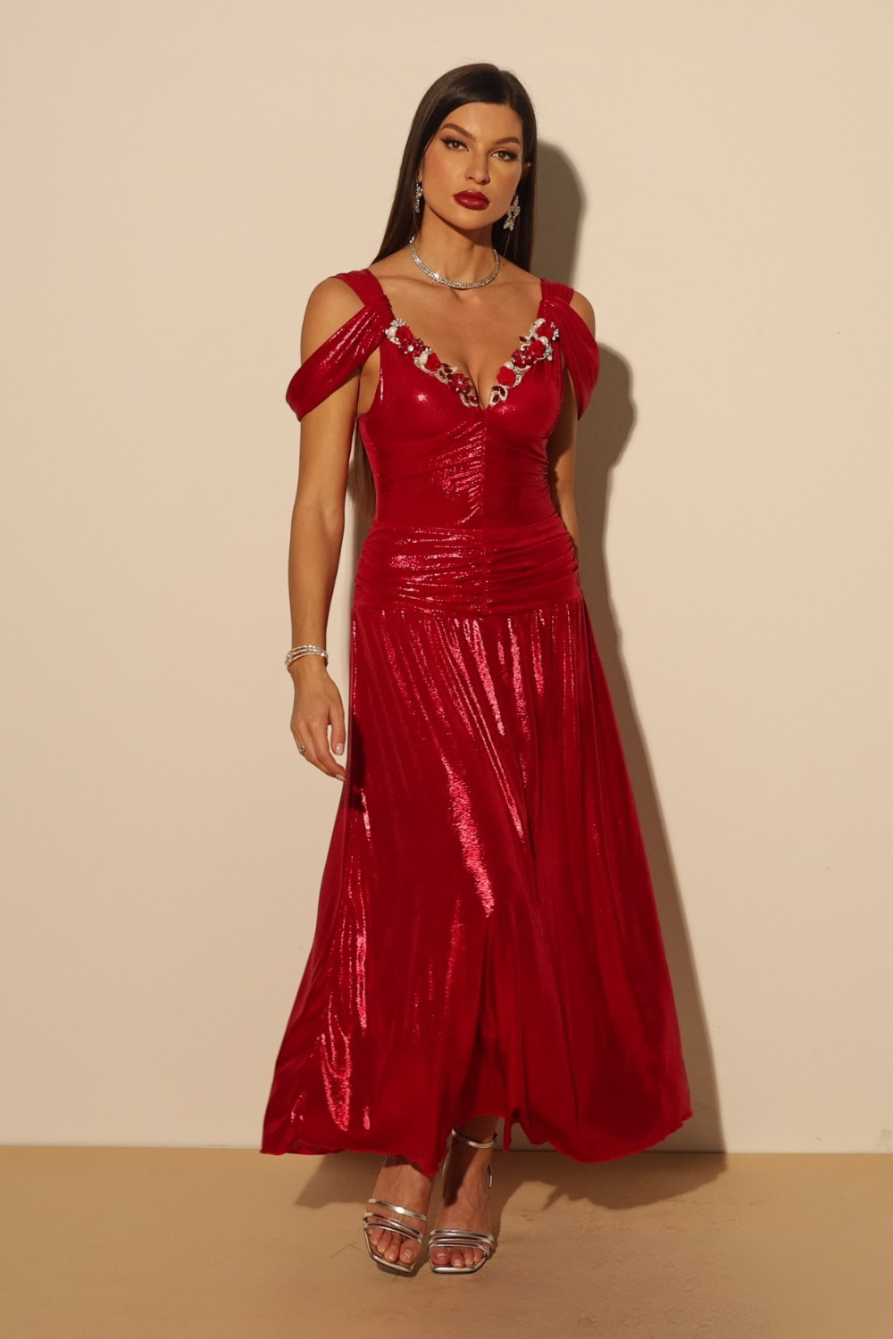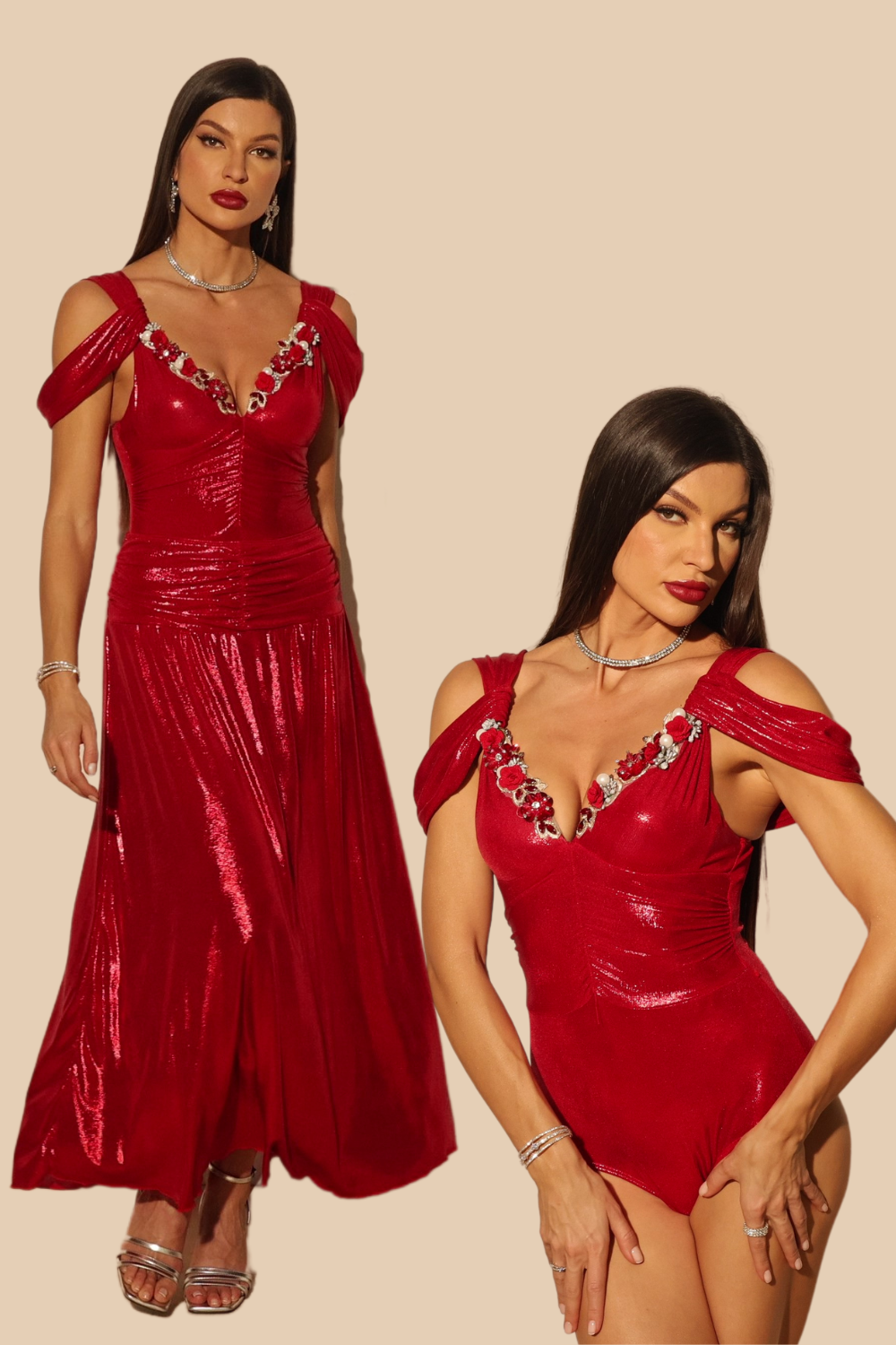 ✨ A Luxe Bodysuit – Crafted from shimmering scarlet fabric with a deep V neckline adorned with dazzling floral embellishments. The structured fit enhances your curves while offering comfort and support.